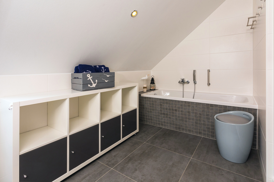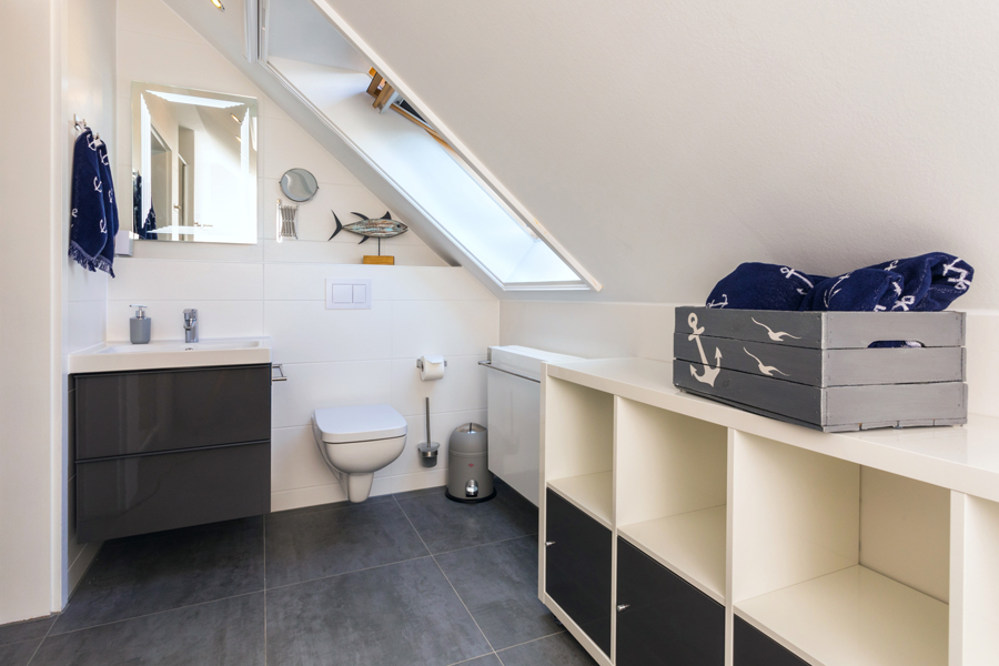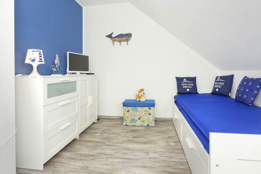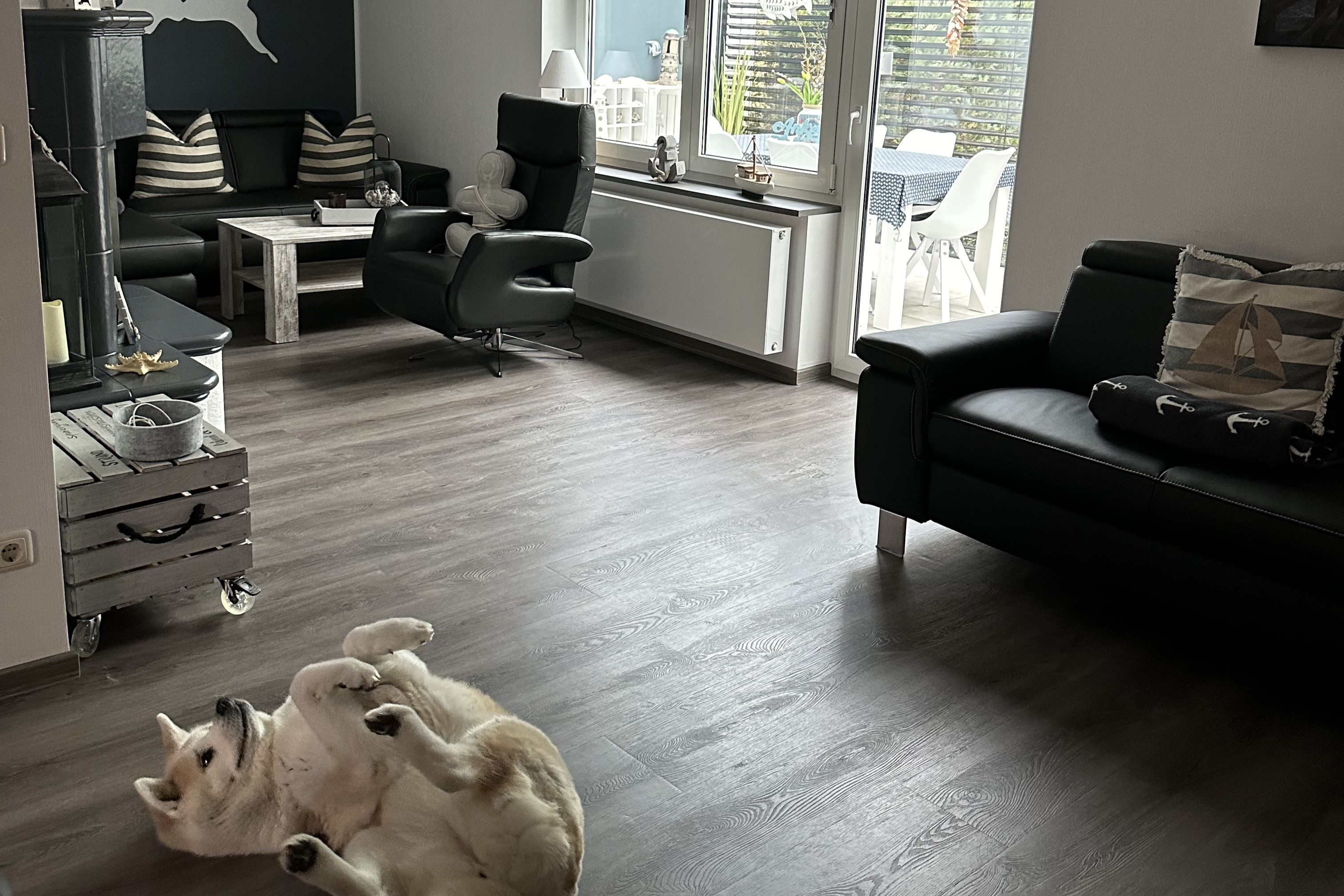 Im Wohnzimmer, Kinderzimmer und Schlafzimmer ist hochwertiger Design Boden verlegt, alle anderen Räume sind gefliest.