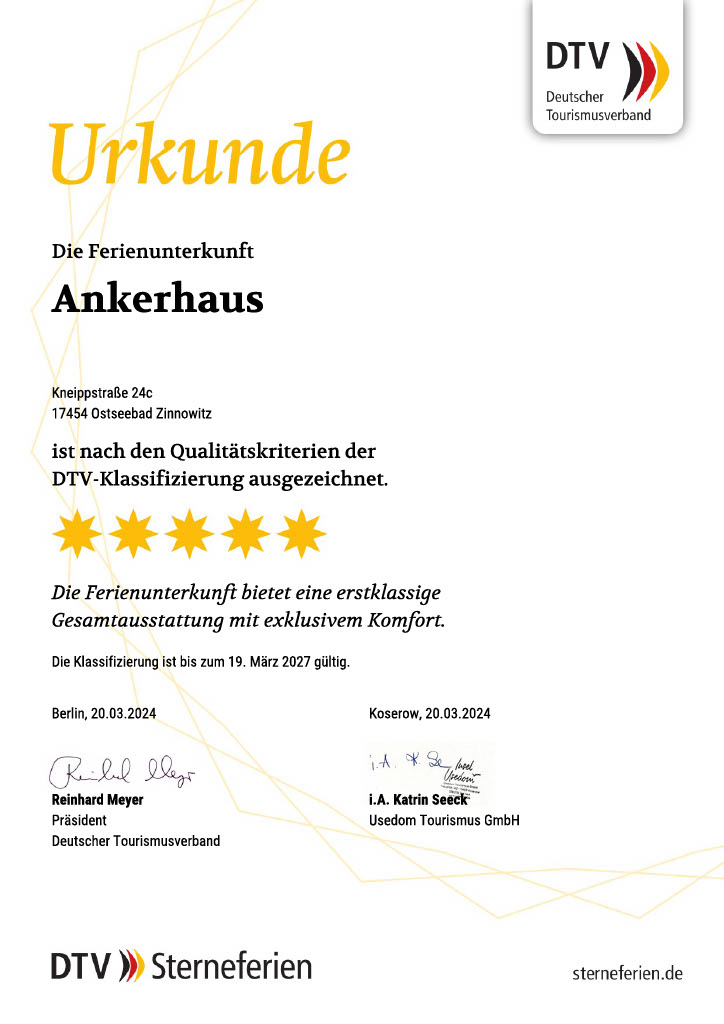 Die Ferienunterkunft Ankerhaus ist nach den Qualitätskriterien der DTV-Klassifizierung ausgezeichnet.